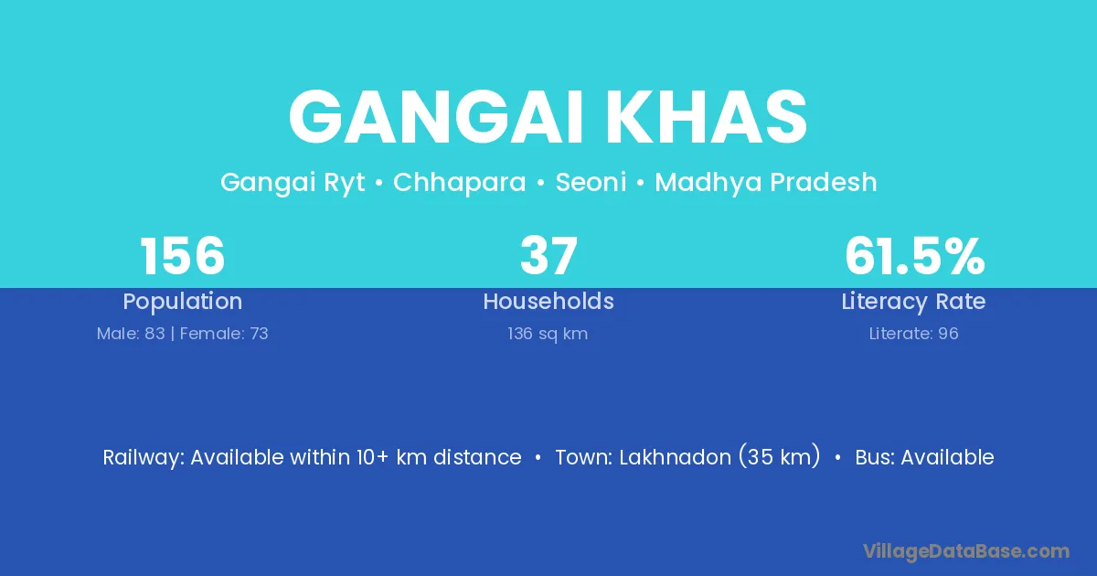 Lakhnadon (35 km) is the nearest town to Gangai Khas village for major economic activities and is located approximately 35 km away.
