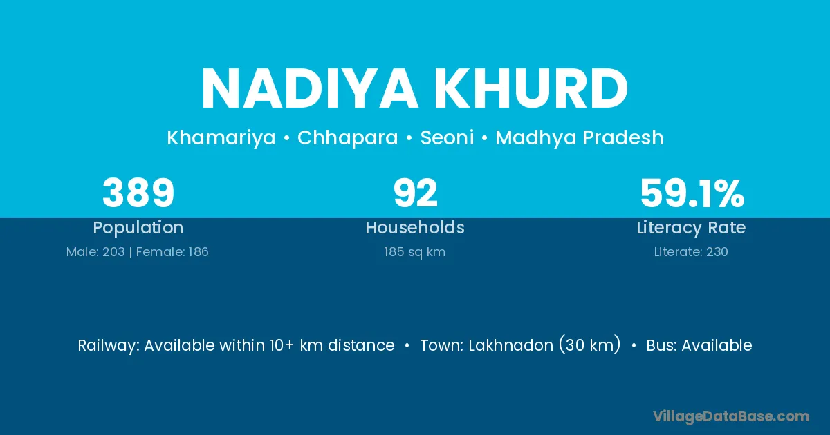 Nadiya Khurd village has a total population of 389 people, of which 203 are males and 186 are females.