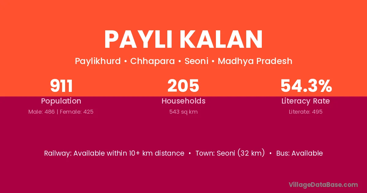 Seoni (32 km) is the nearest town to Payli Kalan village for major economic activities and is located approximately 32 km away.