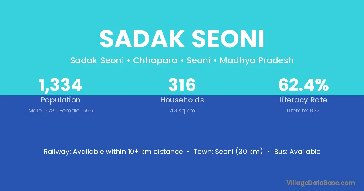Seoni (30 km) is the nearest town to Sadak Seoni village for major economic activities and is located approximately 30 km away.