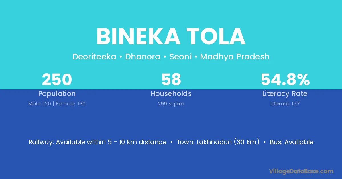 Lakhnadon (30 km) is the nearest town to Bineka Tola village for major economic activities and is located approximately 30 km away.