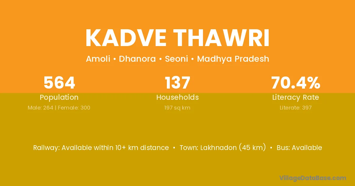 Lakhnadon (45 km) is the nearest town to Kadve Thawri village for major economic activities and is located approximately 45 km away.