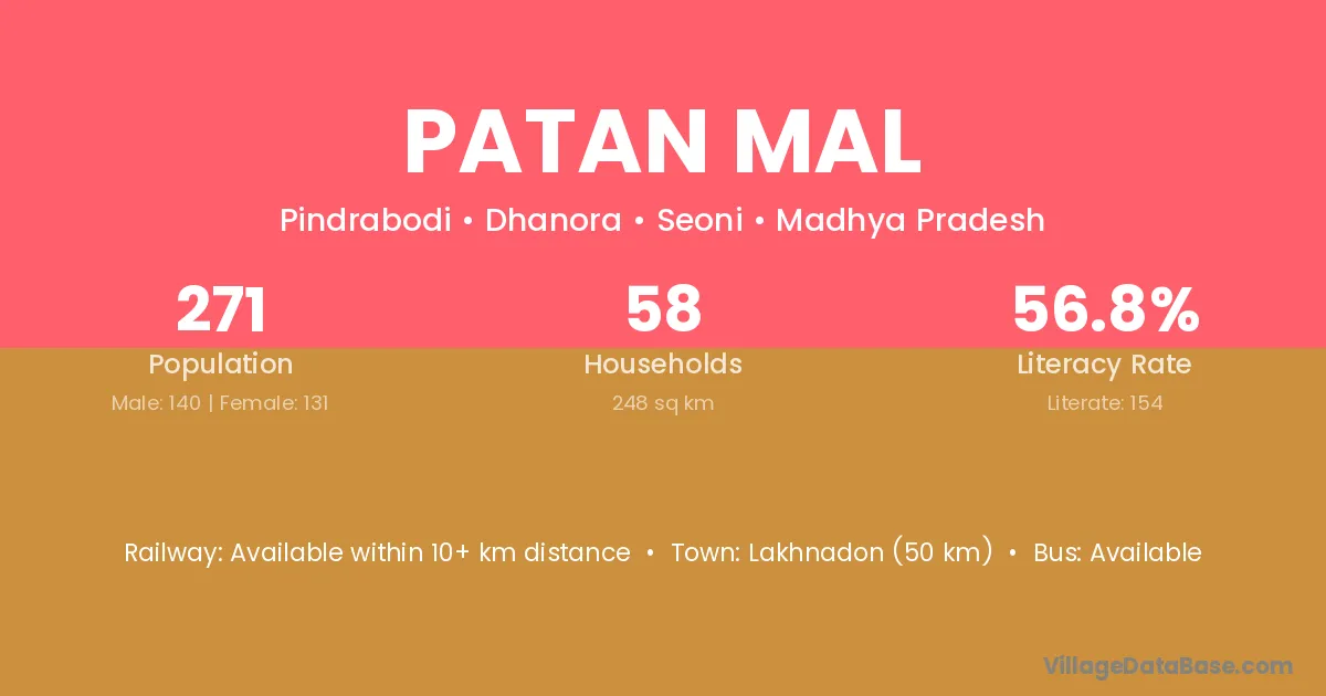 Lakhnadon (50 km) is the nearest town to Patan Mal village for major economic activities and is located approximately 50 km away.