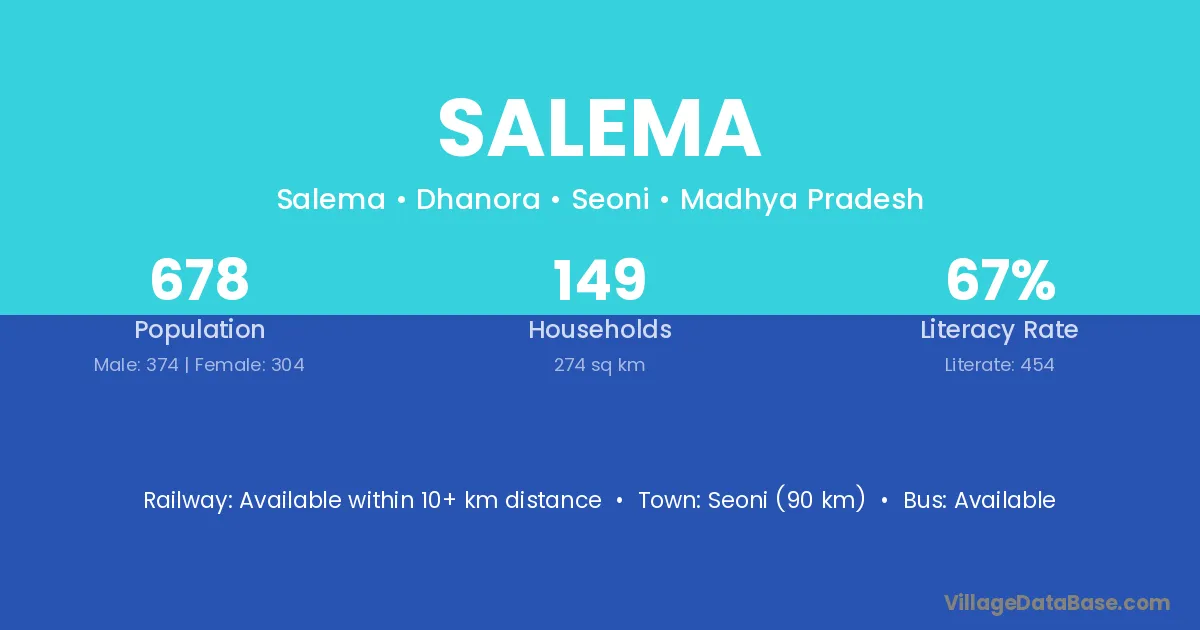 Seoni (90 km) is the nearest town to Salema village for major economic activities and is located approximately 90 km away.