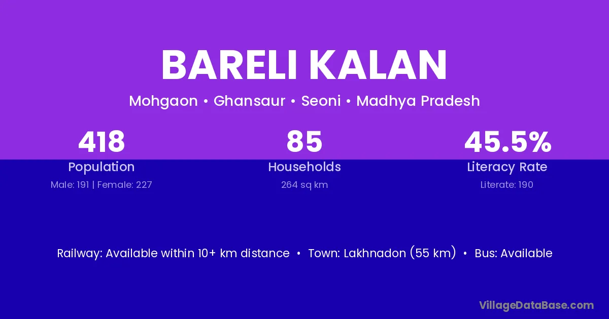 Lakhnadon (55 km) is the nearest town to Bareli Kalan village for major economic activities and is located approximately 55 km away.