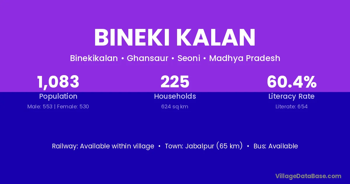 Jabalpur (65 km) is the nearest town to Bineki Kalan village for major economic activities and is located approximately 65 km away.