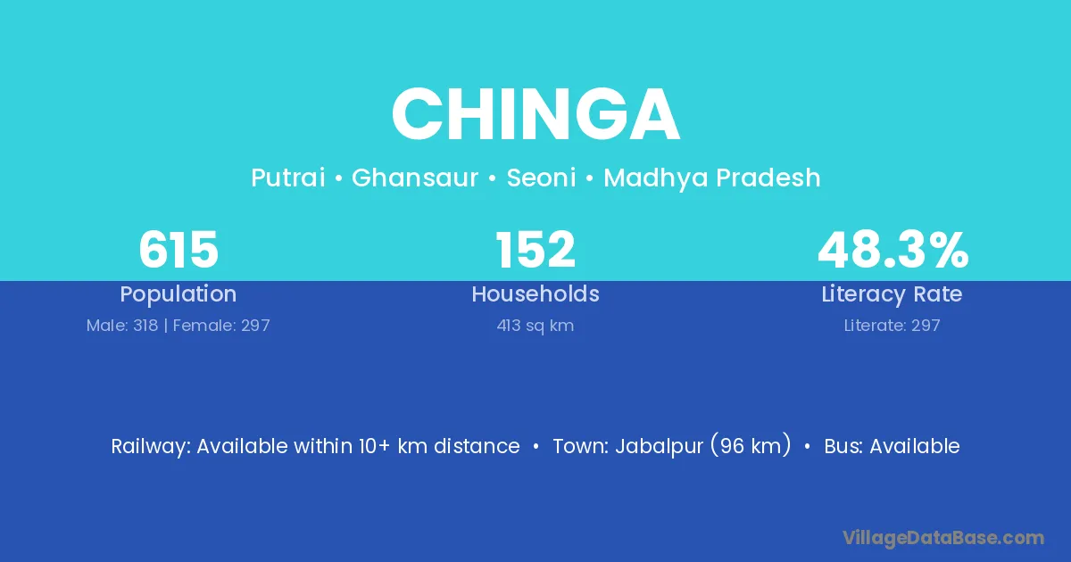 Jabalpur (96 km) is the nearest town to Chinga village for major economic activities and is located approximately 96 km away.