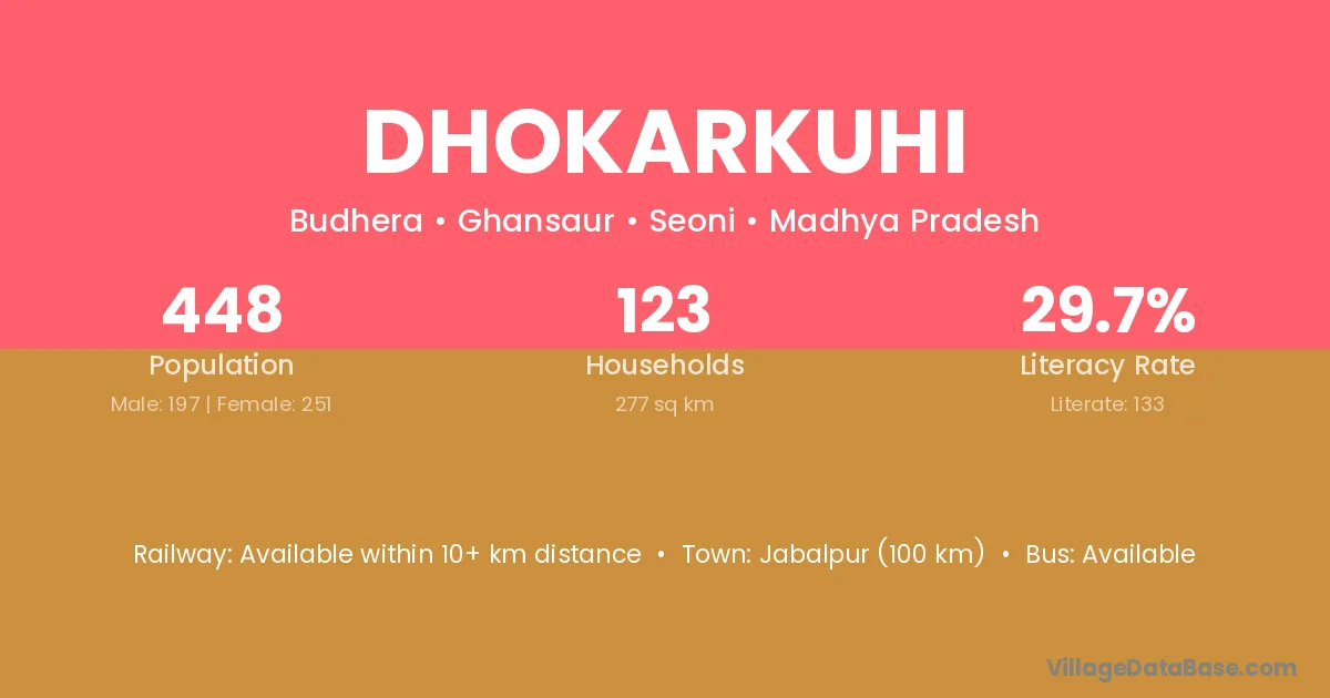 Dhokarkuhi village has a total population of 448 people, of which 197 are males and 251 are females.