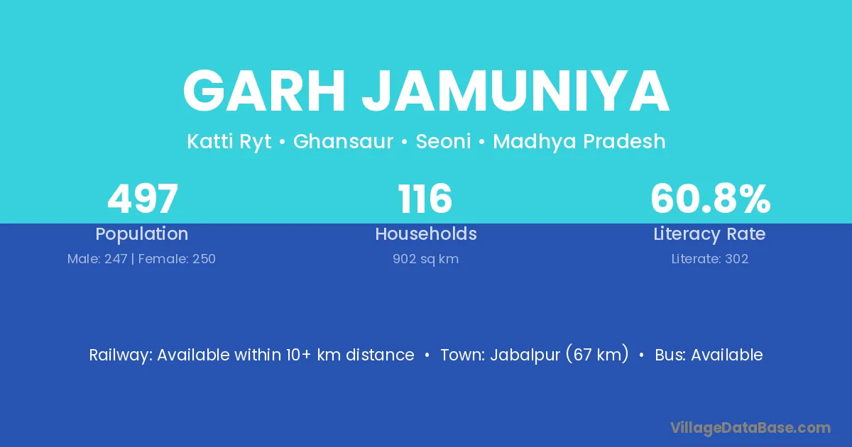 Jabalpur (67 km) is the nearest town to Garh Jamuniya village for major economic activities and is located approximately 67 km away.
