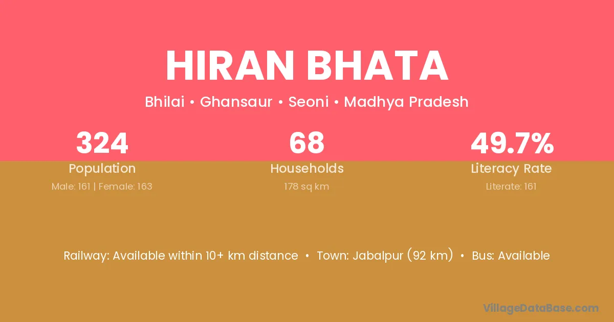 Jabalpur (92 km) is the nearest town to Hiran Bhata village for major economic activities and is located approximately 92 km away.