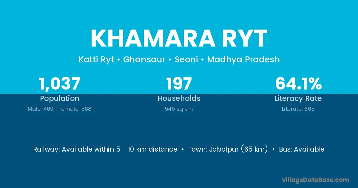 Jabalpur (65 km) is the nearest town to Khamara Ryt village for major economic activities and is located approximately 65 km away.
