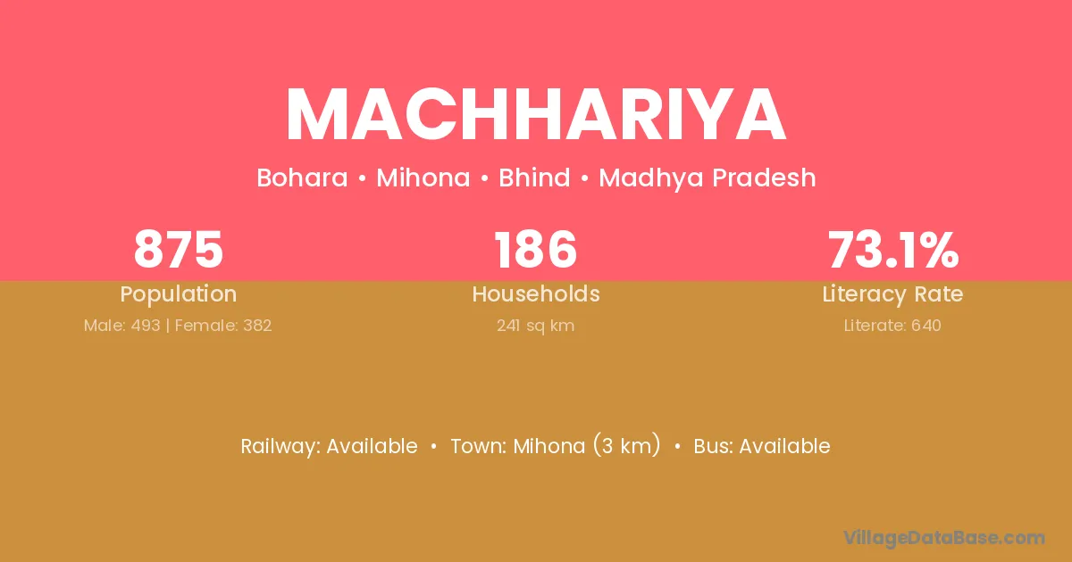 The literacy rate of Machhariya village is 43.93%. Male literacy stands at 48.91% and female literacy at 39.16%.