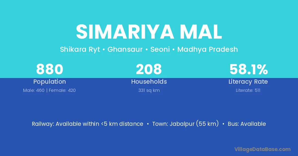 Jabalpur (55 km) is the nearest town to Simariya Mal village for major economic activities and is located approximately 55 km away.
