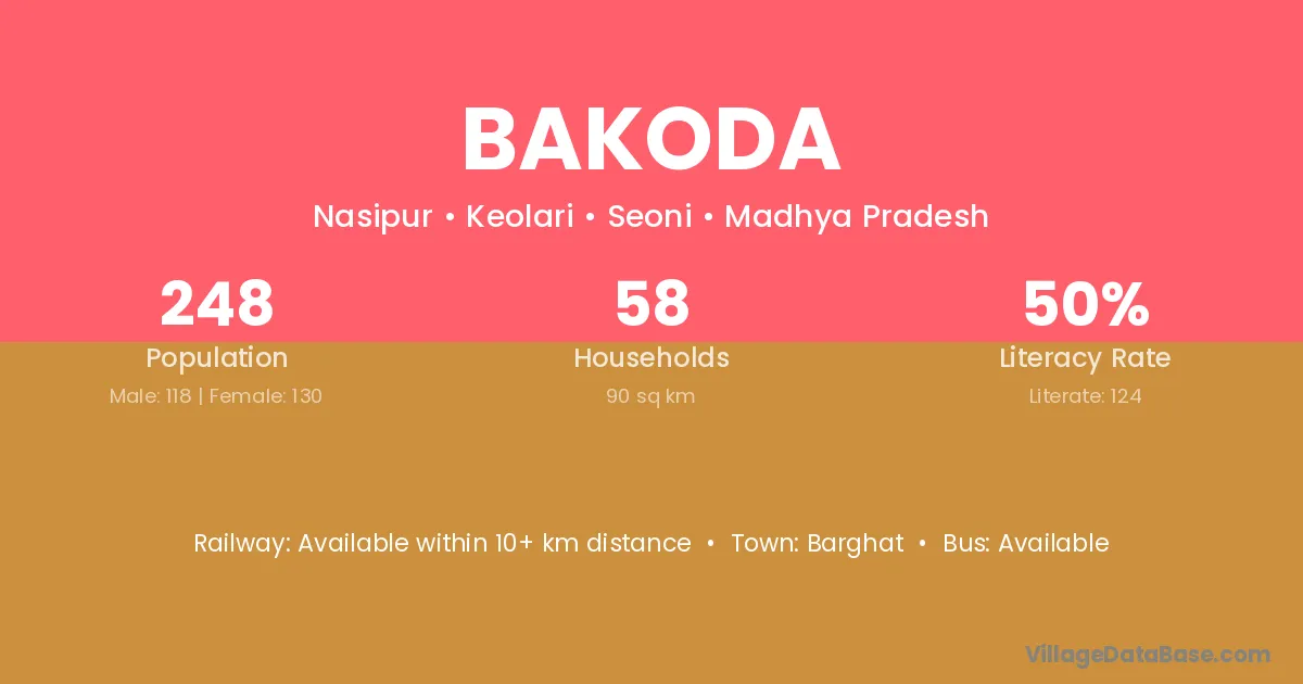 Bakoda village has a total population of 248 people, of which 118 are males and 130 are females.
