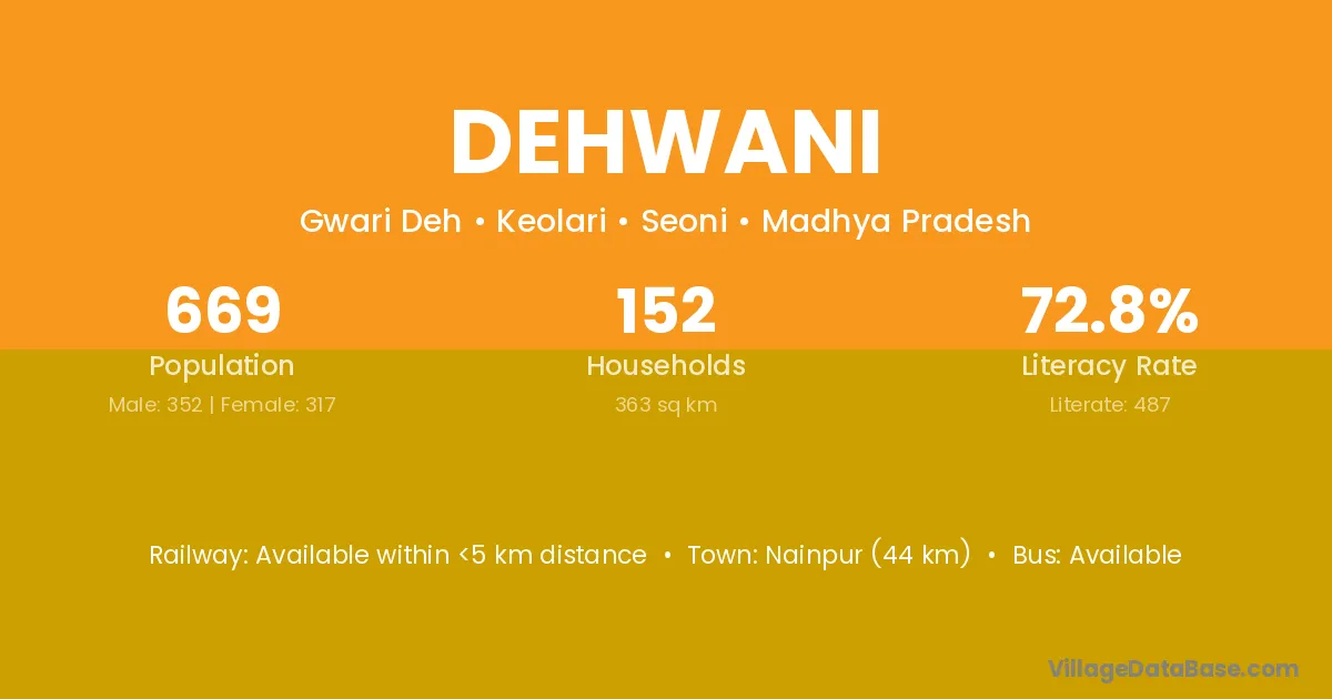 Nainpur (44 km) is the nearest town to Dehwani village for major economic activities and is located approximately 44 km away.