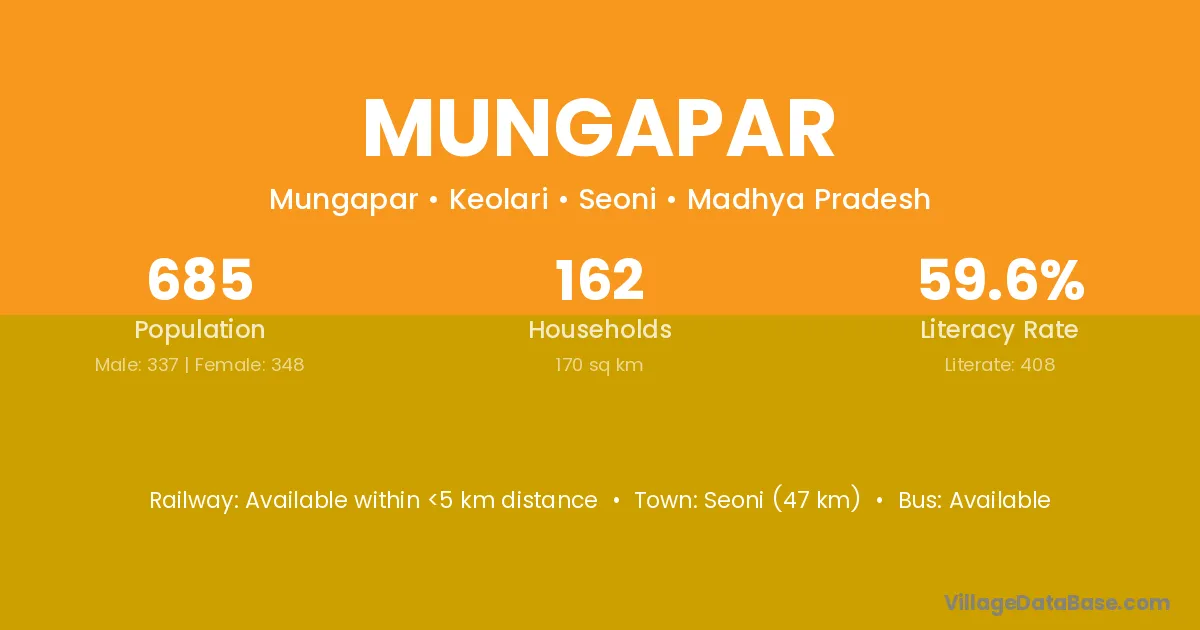 Seoni (47 km) is the nearest town to Mungapar village for major economic activities and is located approximately 47 km away.