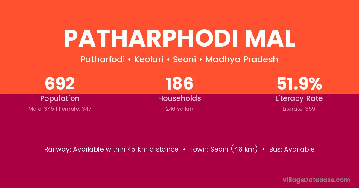 Seoni (46 km) is the nearest town to Patharphodi Mal village for major economic activities and is located approximately 46 km away.