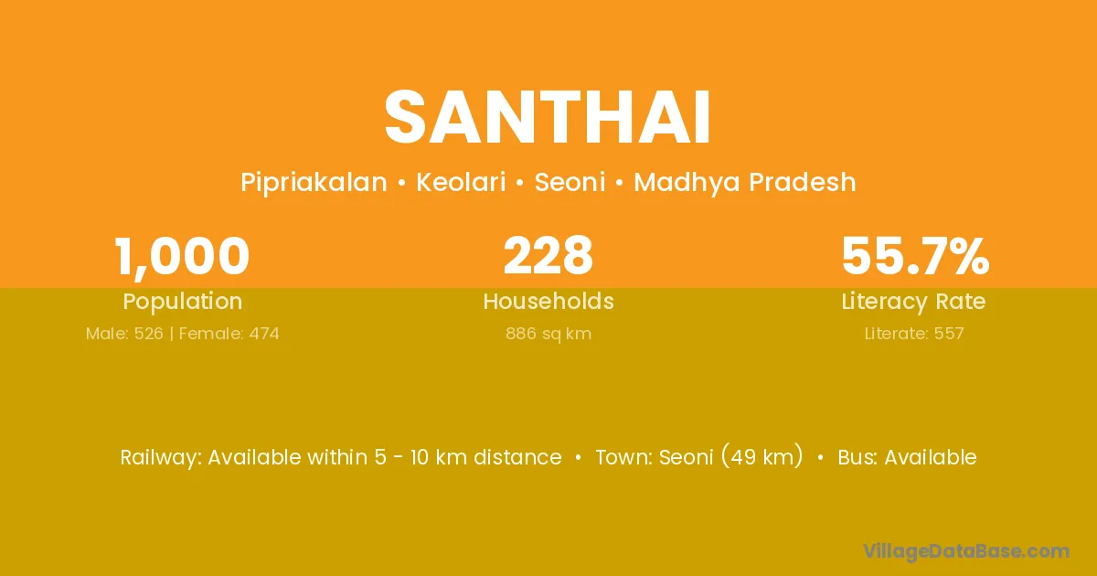 Seoni (49 km) is the nearest town to Santhai village for major economic activities and is located approximately 49 km away.