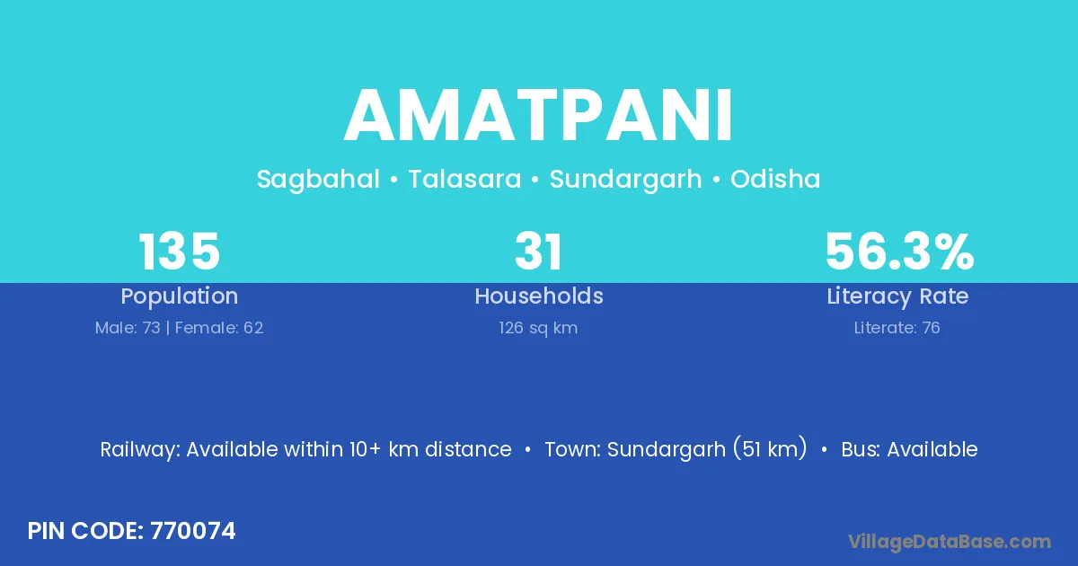Amatpani village has a total population of 485 people, of which 246 are males and 239 are females.