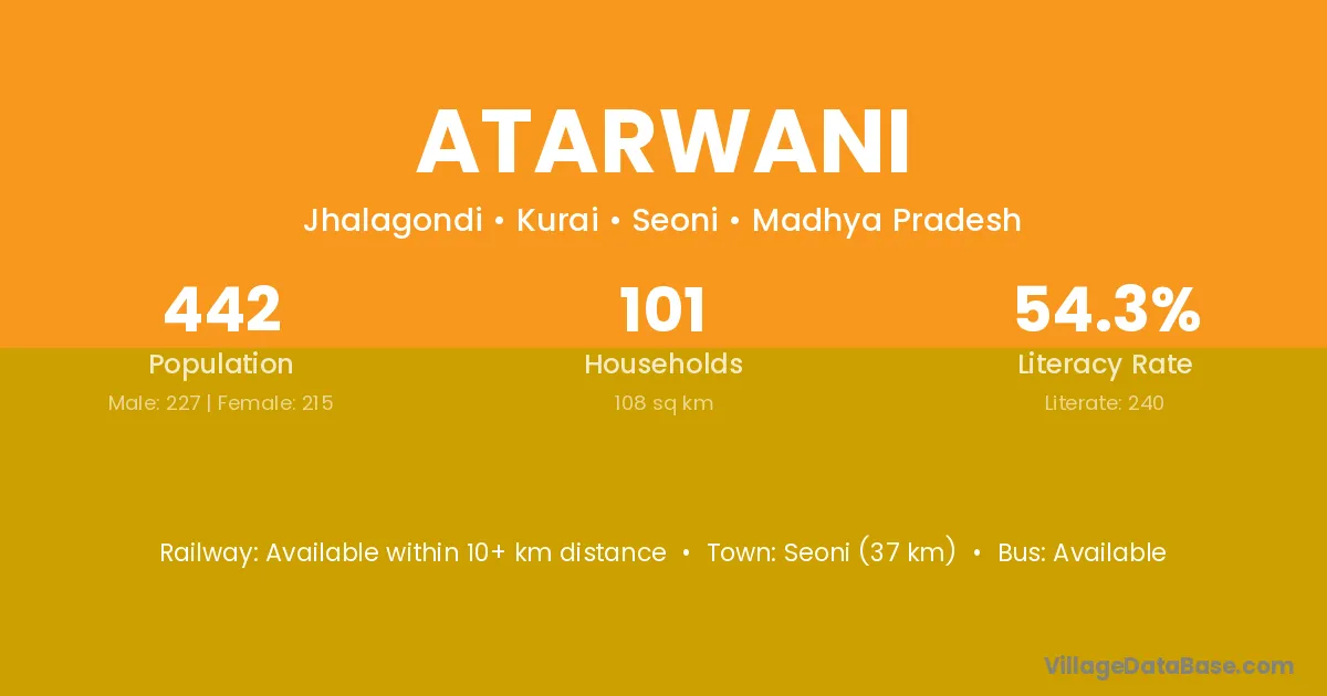 Seoni (37 km) is the nearest town to Atarwani village for major economic activities and is located approximately 37 km away.