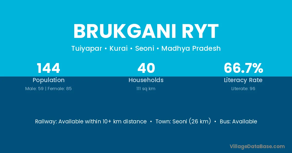 Seoni (26 km) is the nearest town to Brukgani Ryt village for major economic activities and is located approximately 26 km away.