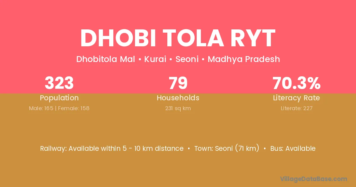 Seoni (71 km) is the nearest town to Dhobi Tola Ryt village for major economic activities and is located approximately 71 km away.