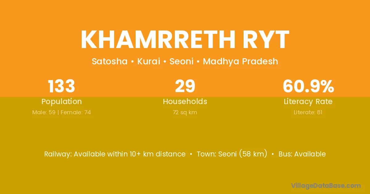 Seoni (58 km) is the nearest town to Khamrreth Ryt village for major economic activities and is located approximately 58 km away.