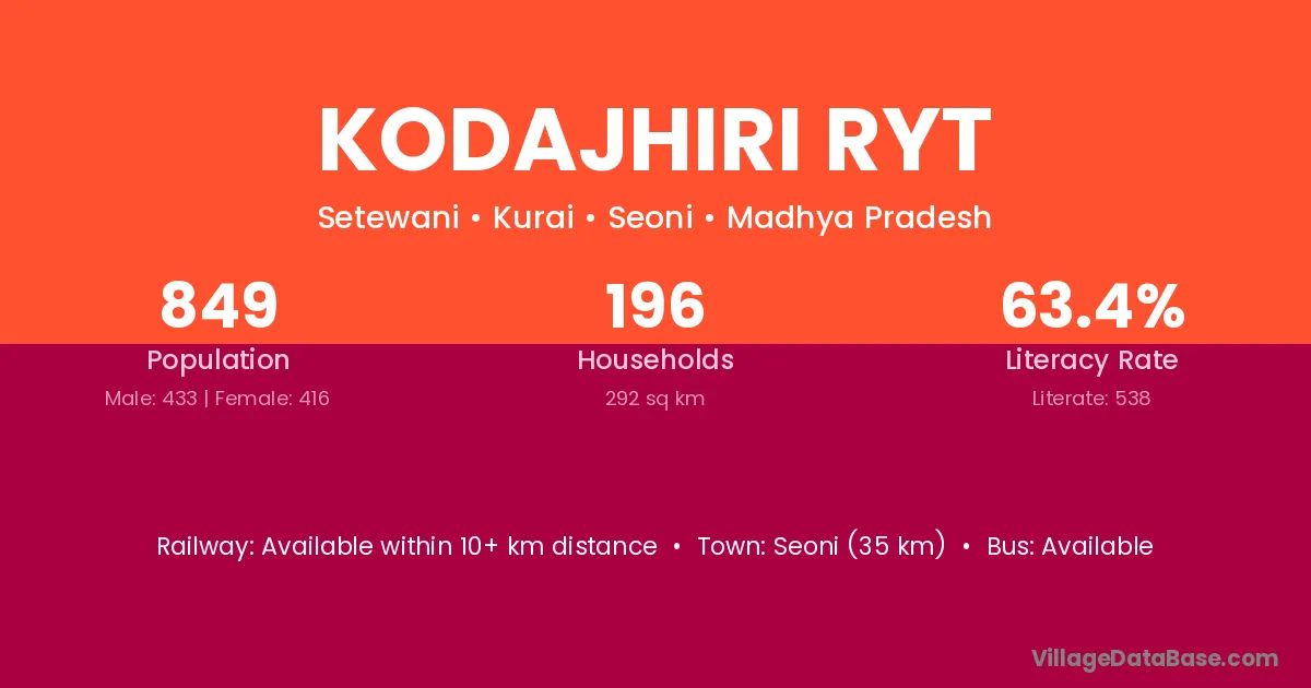 Seoni (35 km) is the nearest town to Kodajhiri Ryt village for major economic activities and is located approximately 35 km away.