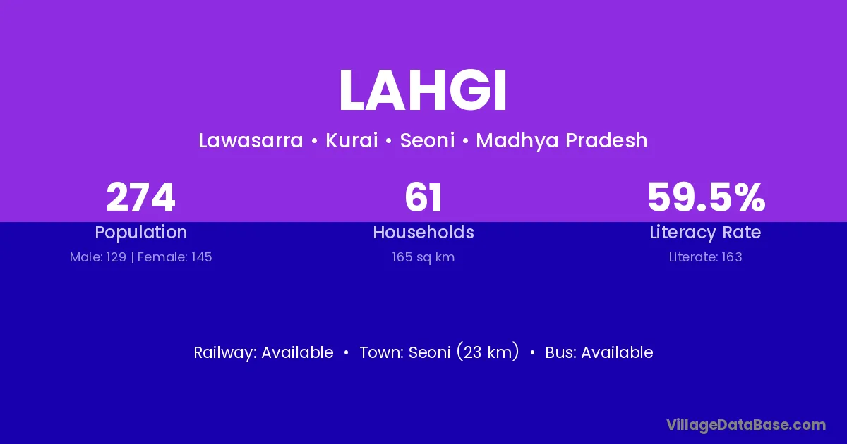Seoni (23 km) is the nearest town to Lahgi village for major economic activities and is located approximately 23 km away.