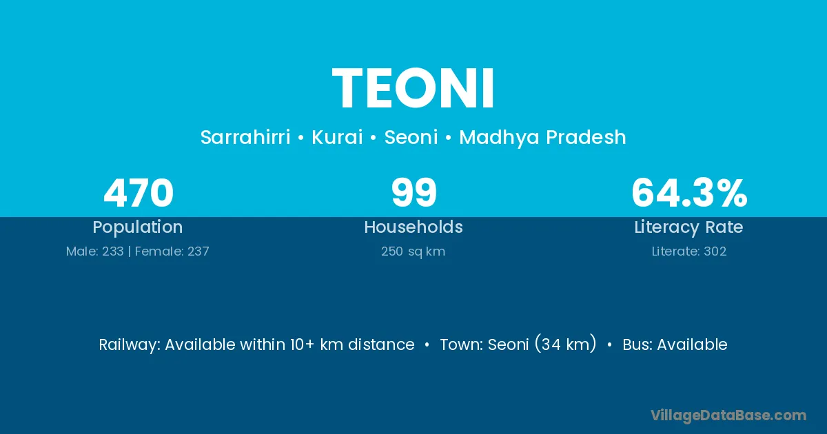 Seoni (34 km) is the nearest town to Teoni village for major economic activities and is located approximately 34 km away.