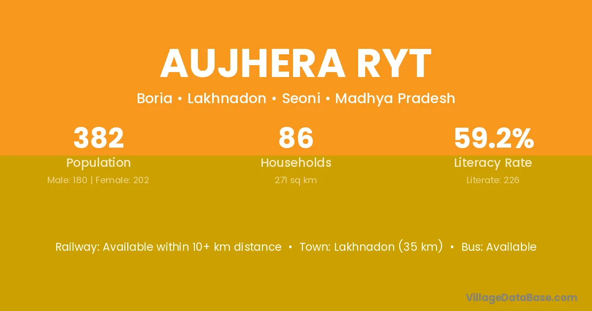 Lakhnadon (35 km) is the nearest town to Aujhera Ryt village for major economic activities and is located approximately 35 km away.