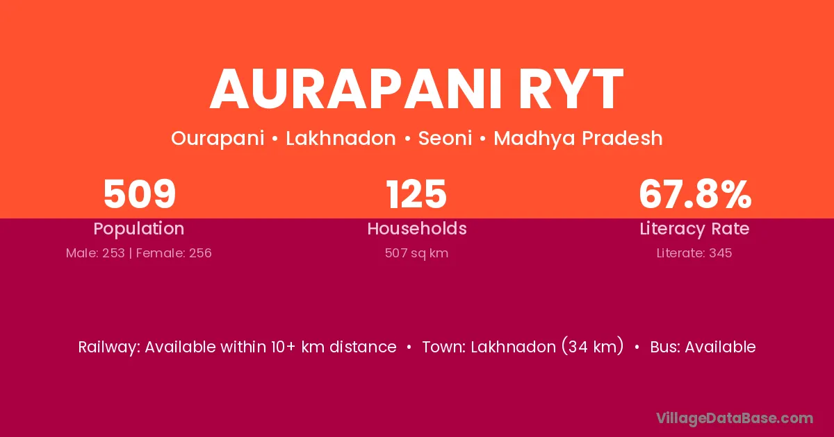 Lakhnadon (34 km) is the nearest town to Aurapani Ryt village for major economic activities and is located approximately 34 km away.