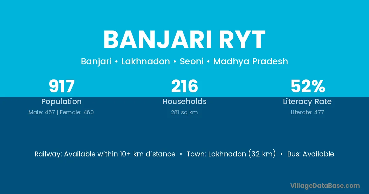 Lakhnadon (32 km) is the nearest town to Banjari Ryt village for major economic activities and is located approximately 32 km away.