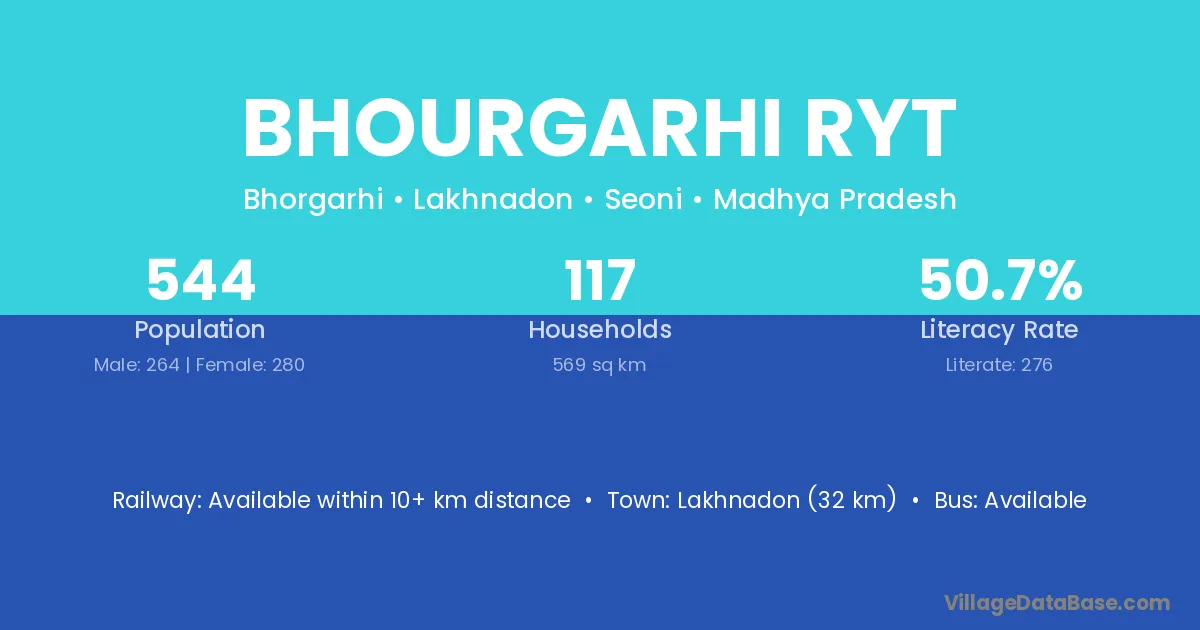 Lakhnadon (32 km) is the nearest town to Bhourgarhi Ryt village for major economic activities and is located approximately 32 km away.