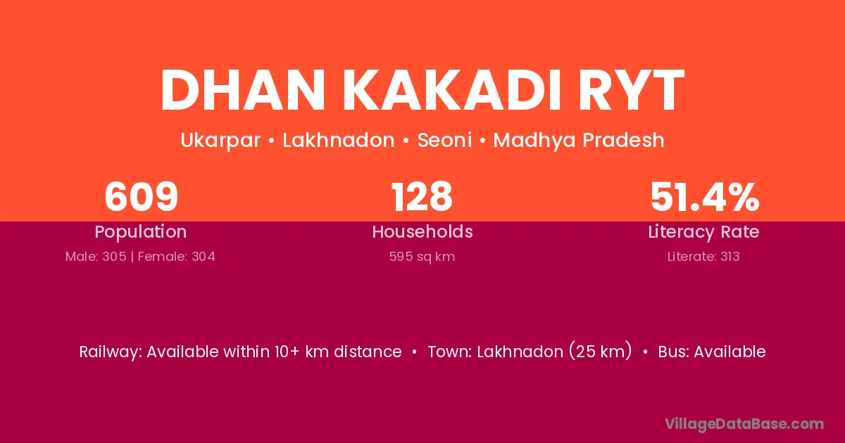 Dhan Kakadi Ryt village has a total population of 609 people, of which 305 are males and 304 are females.