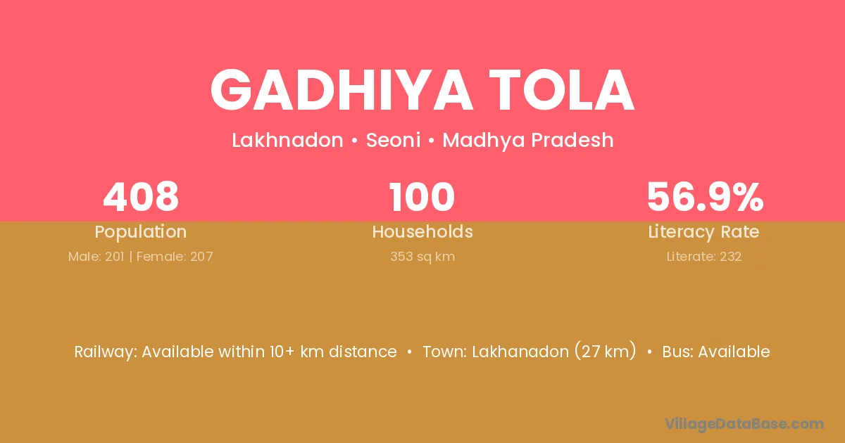 Gadhiya Tola village has a total population of 408 people, of which 201 are males and 207 are females.