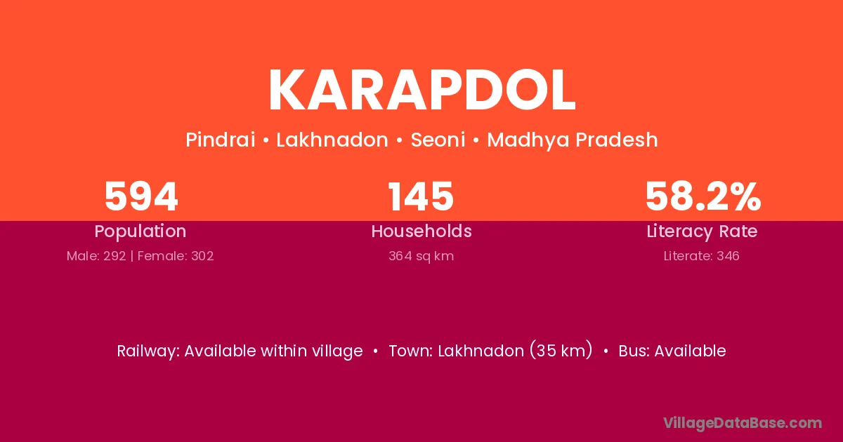 Lakhnadon (35 km) is the nearest town to Karapdol village for major economic activities and is located approximately 35 km away.