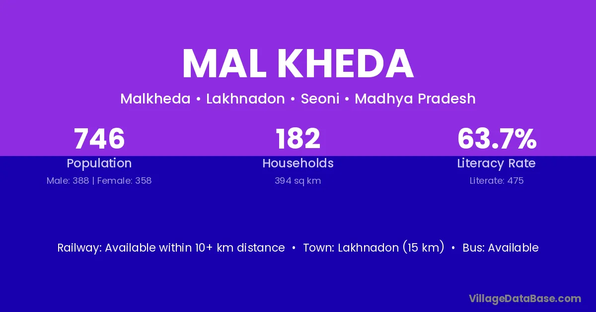 Lakhnadon (15 km) is the nearest town to Mal Kheda village for major economic activities and is located approximately 15 km away.