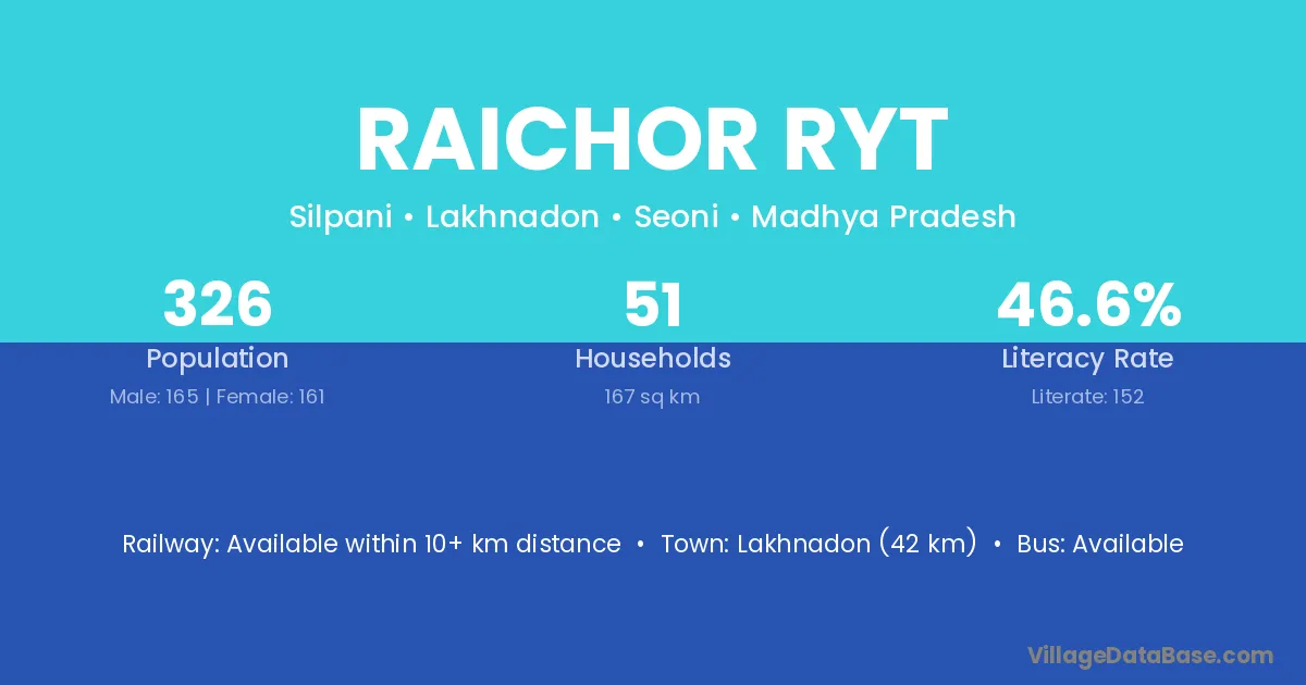 Lakhnadon (42 km) is the nearest town to Raichor Ryt village for major economic activities and is located approximately 42 km away.