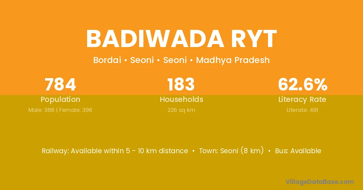 Seoni (8 km) is the nearest town to Badiwada Ryt village for major economic activities and is located approximately 8 km away.