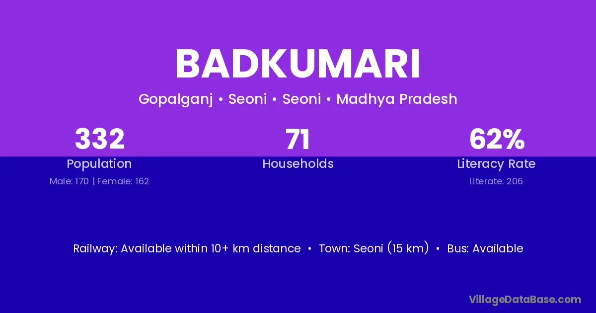 Seoni (15 km) is the nearest town to Badkumari village for major economic activities and is located approximately 15 km away.