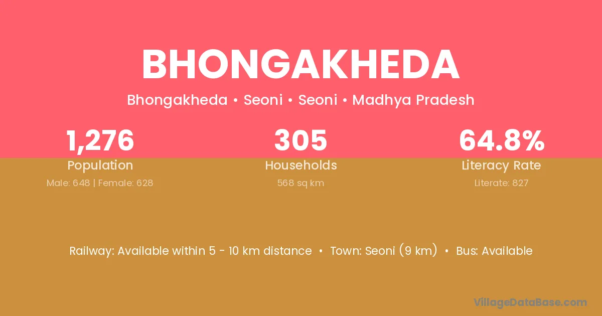Seoni (9 km) is the nearest town to Bhongakheda village for major economic activities and is located approximately 9 km away.