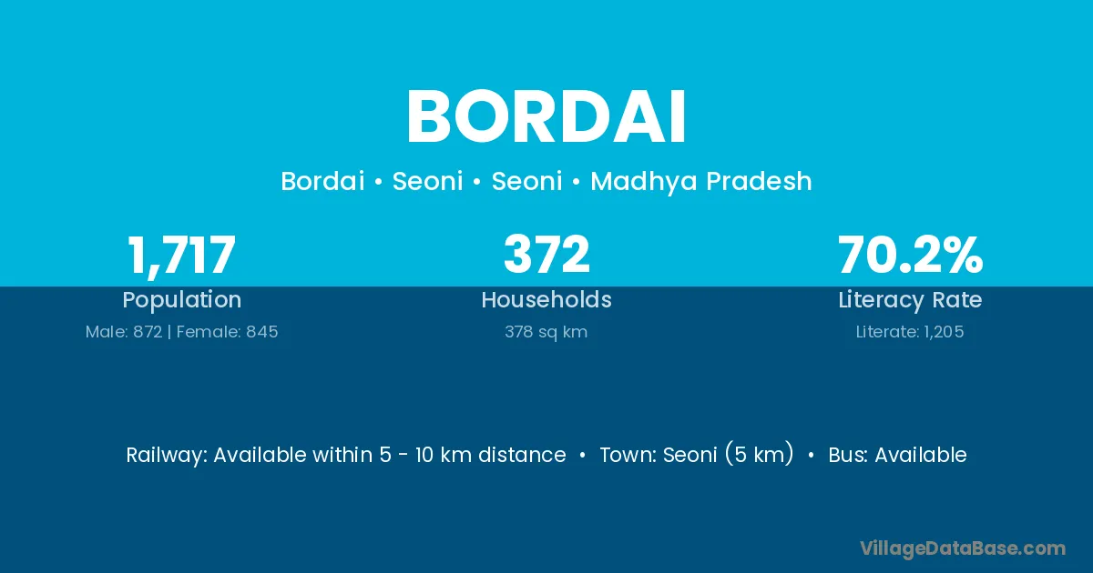 Seoni (5 km) is the nearest town to Bordai village for major economic activities and is located approximately 5 km away.