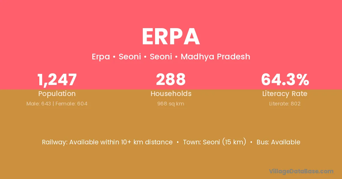 Seoni (15 km) is the nearest town to Erpa village for major economic activities and is located approximately 15 km away.