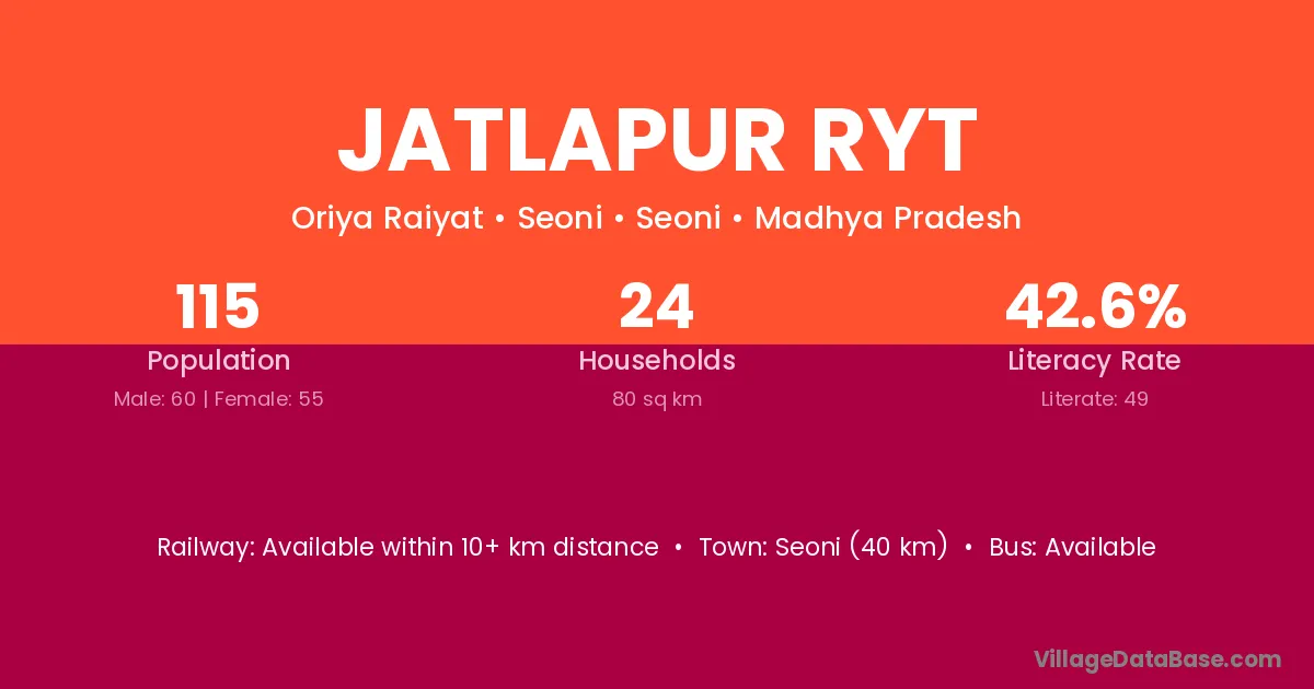 Seoni (40 km) is the nearest town to Jatlapur Ryt village for major economic activities and is located approximately 40 km away.
