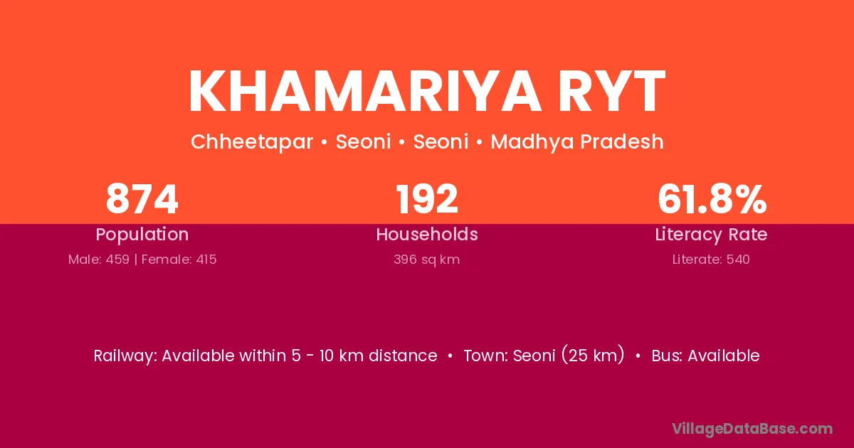 Seoni (25 km) is the nearest town to Khamariya Ryt village for major economic activities and is located approximately 25 km away.