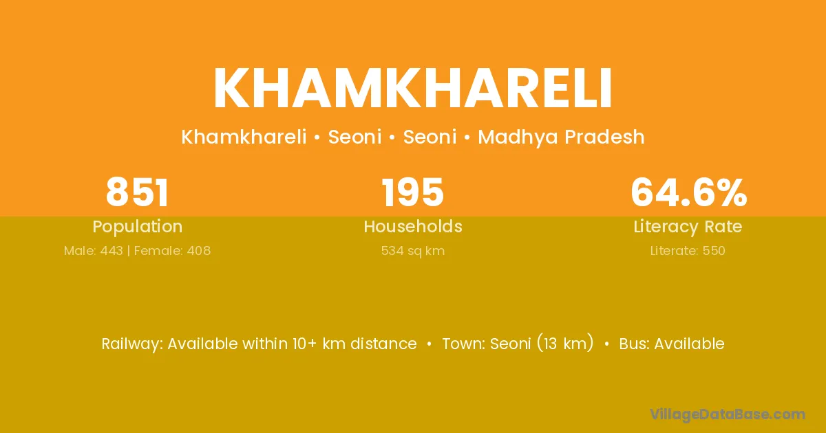 Seoni (13 km) is the nearest town to Khamkhareli village for major economic activities and is located approximately 13 km away.
