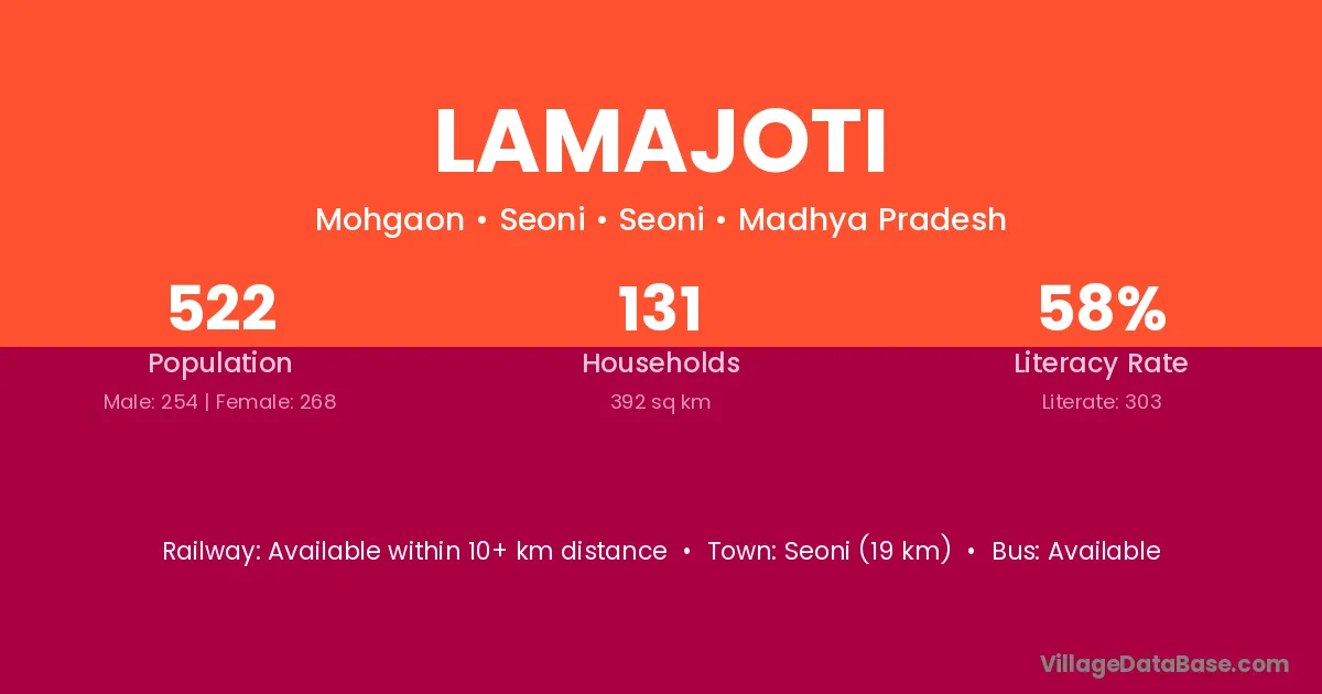 Seoni (19 km) is the nearest town to Lamajoti village for major economic activities and is located approximately 19 km away.