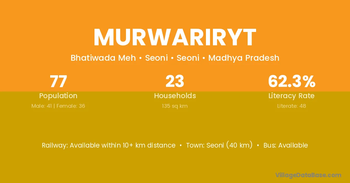 Seoni (40 km) is the nearest town to Murwariryt village for major economic activities and is located approximately 40 km away.