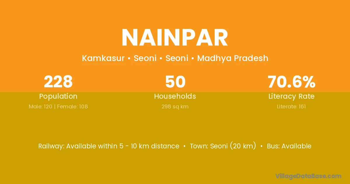 Seoni (20 km) is the nearest town to Nainpar village for major economic activities and is located approximately 20 km away.